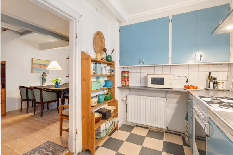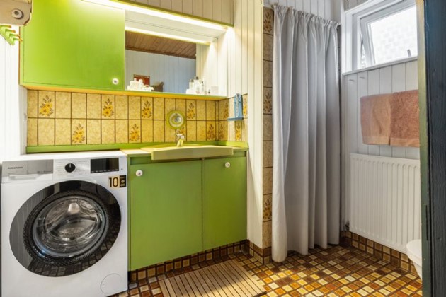 Stueetagen består af alrum og stue i åben forbindelse samt et køkken med blå træfronter. Badeværelset har grønne elementer og klinker, som giver rummet et særpræg.