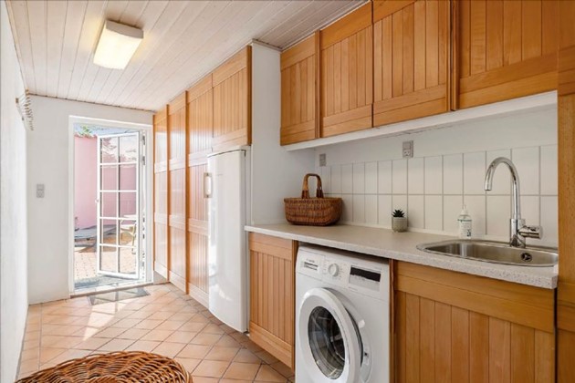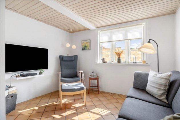 Huset rummer entré, bryggers med udgang til haven, værelse, opholdsstue i åben forbindelse med et Unoform-køkken, flisebadeværelse og en tv-stue. På førstesalen findes et repos med plads til skrivebord samt et værelse med indbyggede skabe.