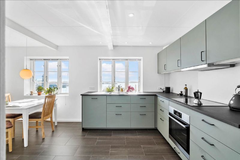 Stueplan indeholder entre med trappe til 1. sal, gæstetoilet, nyere badeværelse, lækkert vinkelkøkken medudsigt til havneindsejlingen samt åbent til spiseafdelingen og værelse, som også kan fungere som sofastue.