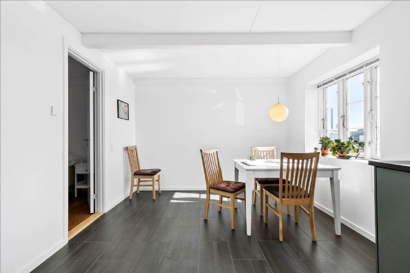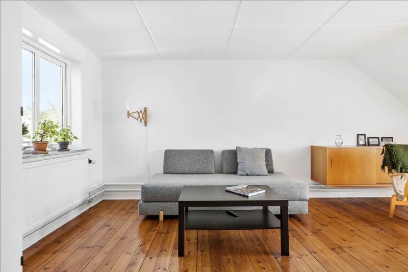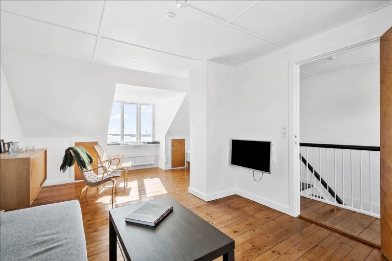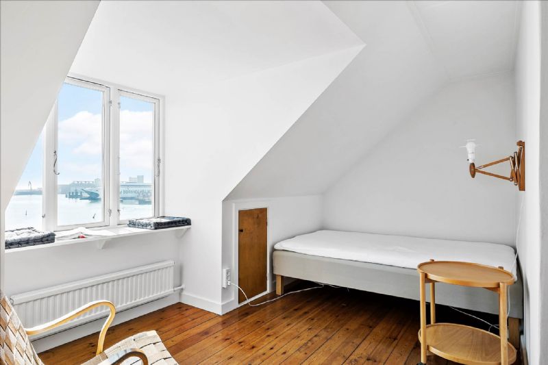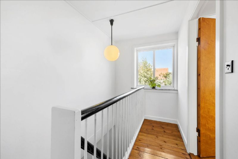 1. sal indeholder stort vinkelværelse med ny kvist, men værelset kan nemt deles op i to mindre værelser. Mindre repos med plads til kommode, skrivebord eller andet.