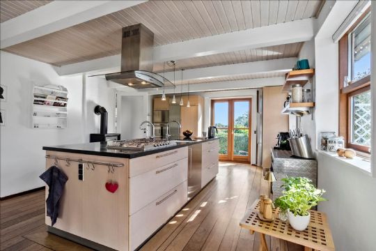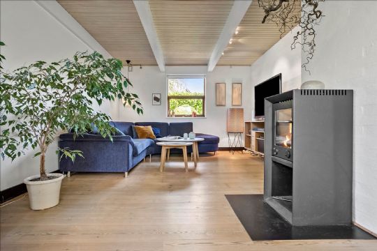 Foto: EDC BornholmerBoBoligens naturlige samlingspunkt er det store køkkenalrum med køkkenø, brændeovn og direkte udgang til haven, mens planløsningen byder på flere værelser, to badeværelser og en lys førstesal med stort opholdsrum.
