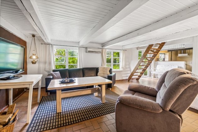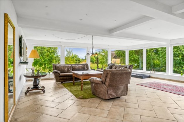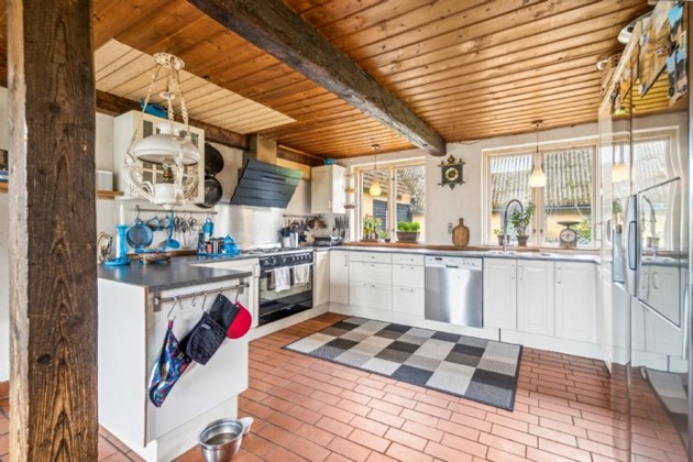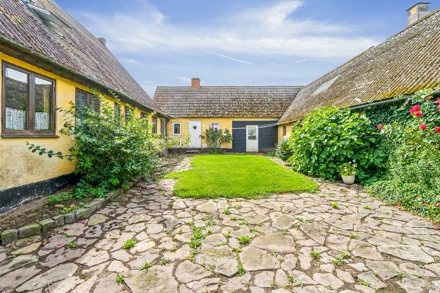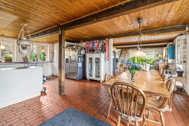 Den firelængede gård byder på masser af plads, både inde og ude. Hovedhuset er indrettet med store, lyse rum, der er perfekte for en større børnefamilie. Køkken-alrummet fungerer som hjemmets centrale samlingspunkt med karakteristiske detaljer som markante bjælker og gulvtegl, der tilføjer sjæl og charme. Der er også flere rummelige stuer, som kan indrettes på forskellige måder efter behov.