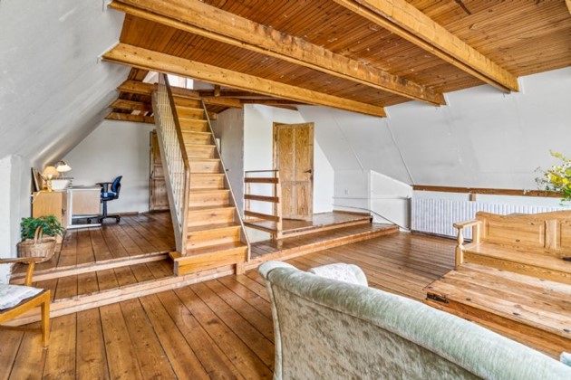 På førstesalen finder man yderligere to værelser og en stue, der giver adgang til en tagterrasse. Øverst oppe er der to ekstra værelser, der tilbyder endnu mere plads. Derudover er der et fritliggende gæstehus med gode boligforhold, ideelt til besøgende eller som separat bolig.