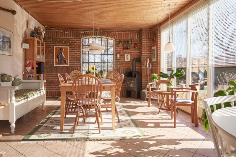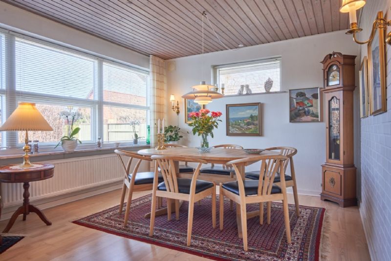 Huset indeholder entre, gæstetoilet, spisekøkken, vinkelstue på 44 kvadratmeter med udgang til helårsisoleret havestue med gulvvarme og brændeovn.