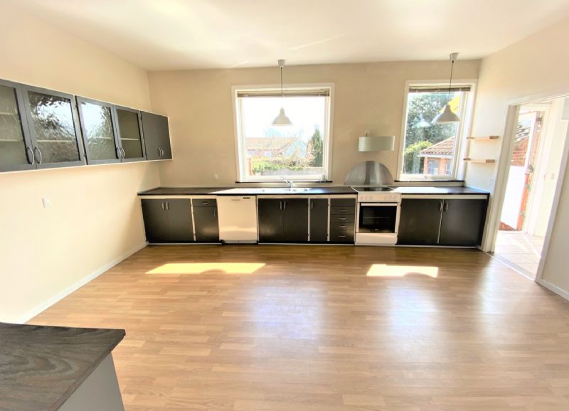 Stort køkken med plads til det store langbord, og dejligt lysindfald og kig til gården.