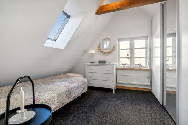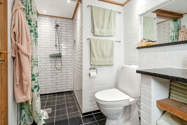 I stueetagen findes også et moderne badeværelse med separat bruseafsnit og et håndvaskmøbel i Paradisbakke-granit, der tilføjer et strejf af lokal æstetik til rummet. Førstesalen rummer to værelser og en repos, der tilbyder betagende udsigter over vandet, hvilket gør hver morgen til en unik oplevelse.