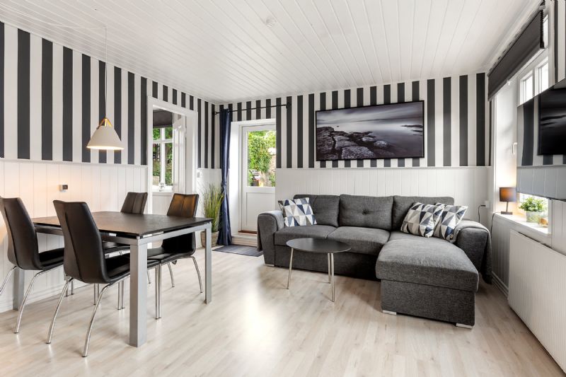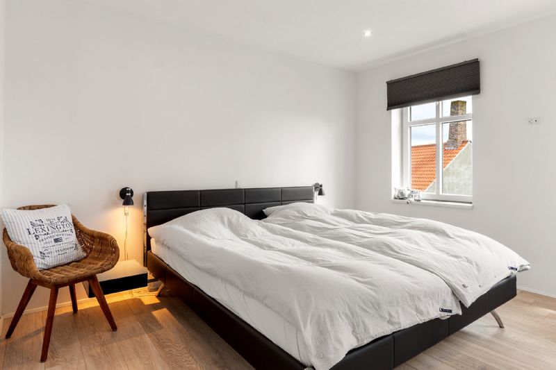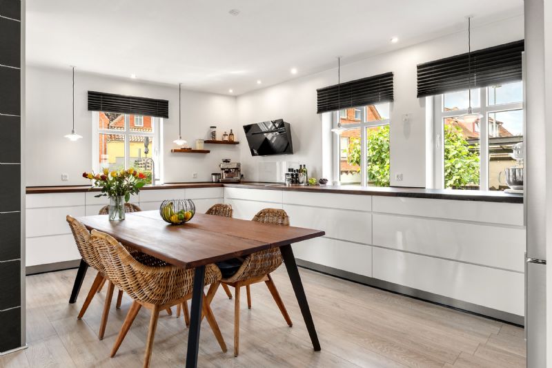 Indretningen bærer præg af minimalistisk elegance, hvor klassiske detaljer møder moderne materialer. Brændeovnen i stueetagen suppleres af sorte fliser, mens køkkenet er indrettet med grebsløse fronter, bordplader i flot finish og god arbejdsplads.