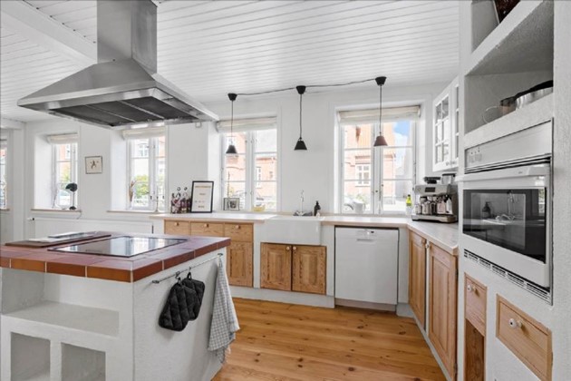 Hovedhuset på 152 m² byder på en rummelig entré/bryggers med god skabsplads samt vaskemaskine og tørretumbler. Det charmerende køkken har moderne hvidevarer, en praktisk kogeø og åben forbindelse til spisestuen. Den lyse og hyggelige stue har trægulv, brændeovn og udgang til en terrasse. Desuden er der en flot entré med trappe til første sal samt et stilfuldt badeværelse med muret bruseniche og gulvvarme.