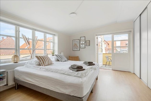 Gæstehuset på 122 m² er en fuldt udstyret bolig med egen entré, toilet, soveværelse og et flot køkken/alrum med kogeø. Stuen har udgang til en terrasse, mens første sal rummer to store værelser, begge med skabe og adgang til hver deres altan/tagterrasse. Der er også et badeværelse med bruseniche.