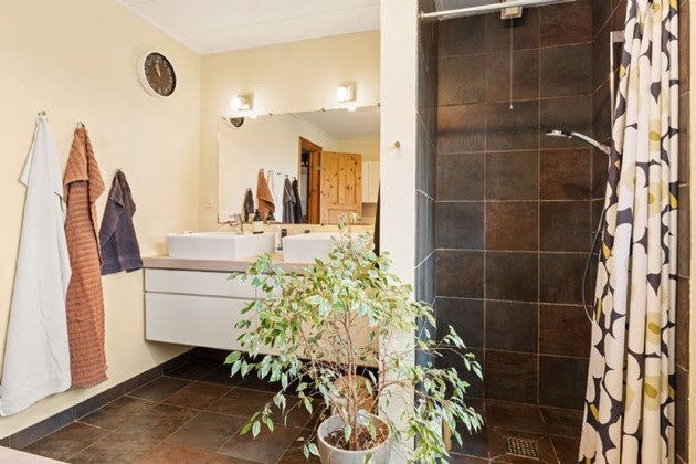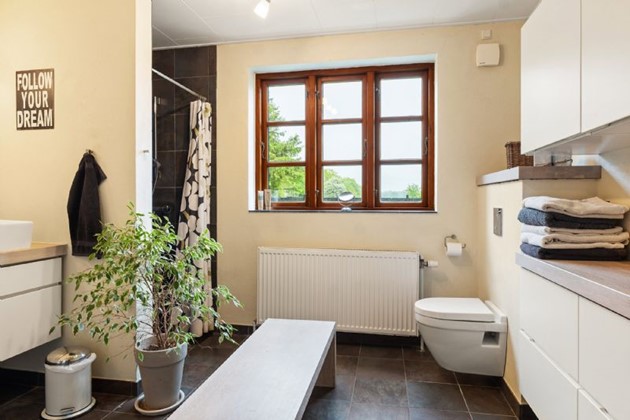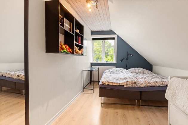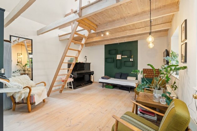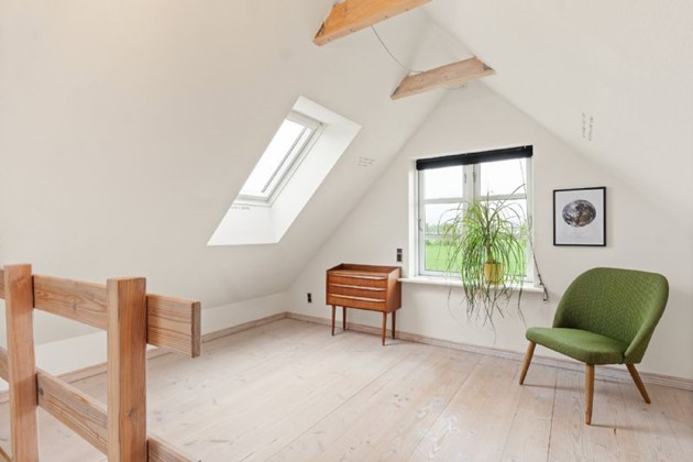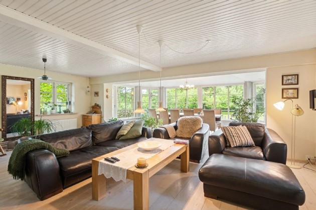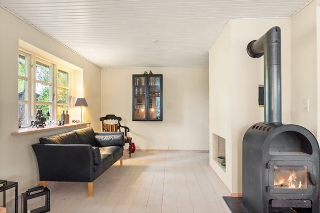 Ejendommen ligger tilbagetrukket fra vejen i fredelige omgivelser – men stadig tæt på offentlig transport og med moderne komfort i harmoni.