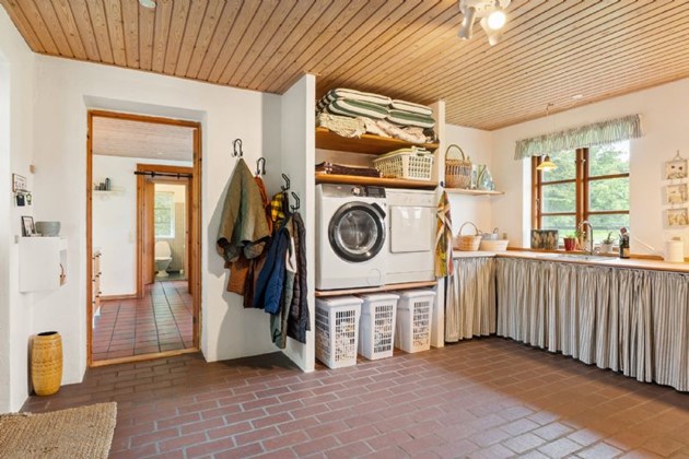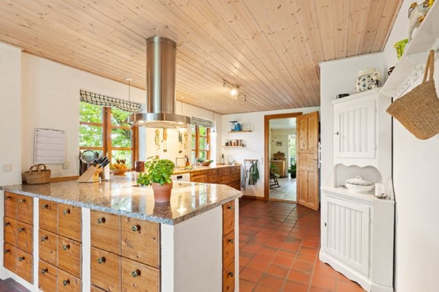 Stueetagen byder på værksted, stort bryggers, badeværelse, gæstetoilet og et hyggeligt landkøkken, som binder hverdag og samvær sammen. I stuen skaber brændeovnen varme og hygge, mens de store vinduer giver et enestående panoramaudsyn over det bornholmske landskab.