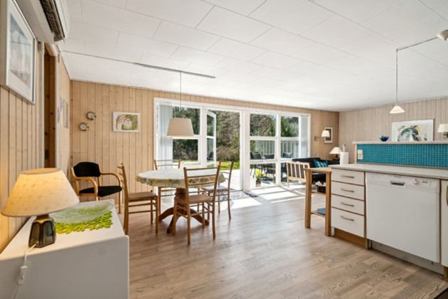Det åbne opholdsområde tilbyder en lys og indbydende atmosfære, med masser af naturligt lys fra syd- og vestvendte vinduer, og en terrassedør der åbner op til udsigten mod søen. Køkkenet kombinerer funktionalitet med et klassisk æstetisk udtryk og ligger i åben forbindelse med opholdsstuen, hvilket fremmer et socialt miljø.