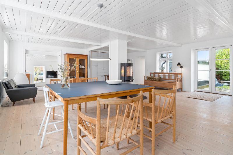 Køkkenet følger nutidens trends med messinggreb og messingarmatur samt en flot, hvid Corian-bordplade, og både fyrretræsgulvene og den væghængte brændeovn understreger den hyggelige atmosfære.