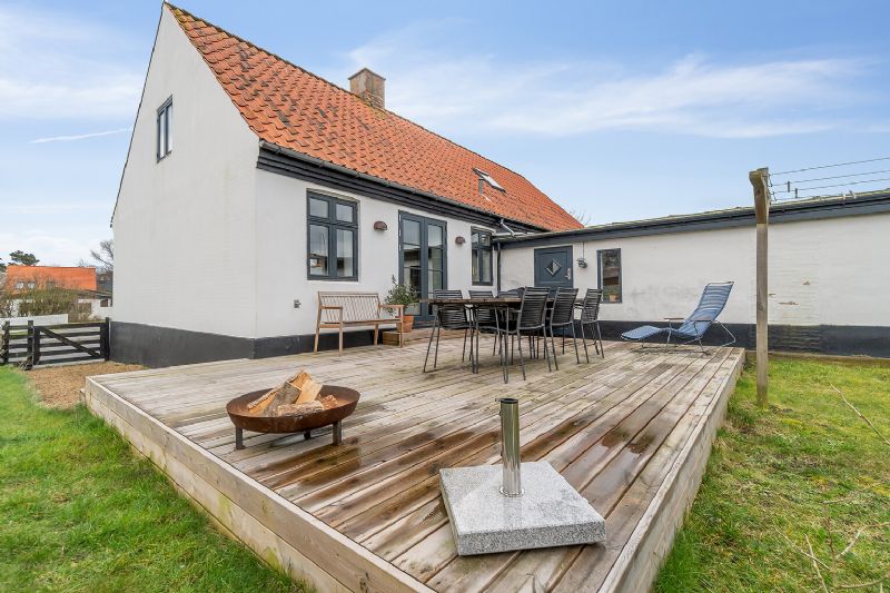 Fra køkkenet er der direkte udgang til terrassen. Terrassen er orienteret mod vest, hvorfor solen kan nydes, helt til den går ned, og her er samtidig plads til udfoldelser rundt om huset.