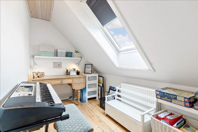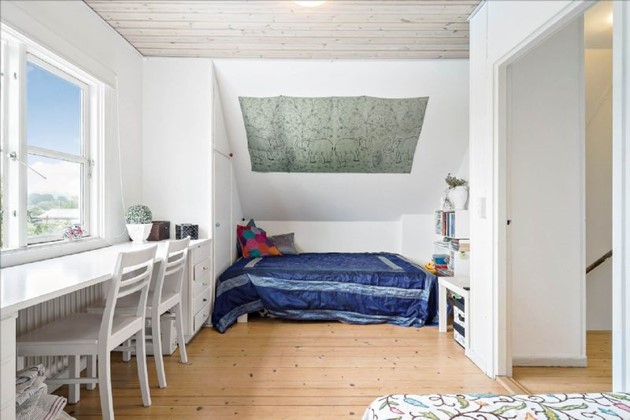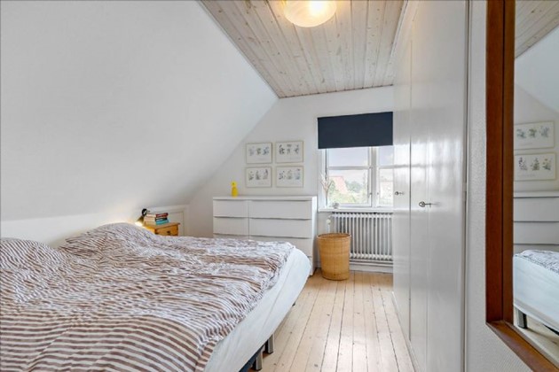 På 1. salen findes en repos, et stort soveværelse, et godt værelse med skabe og et lille værelse/depotrum.