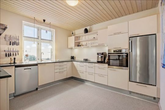 Foto: EDC BornholmerBoI stueplan findes bryggers og hverdagsentré med plads til vaskefaciliteter og opbevaring, et stort køkken med spiseplads samt to hyggelige stuer. Den ene stue har brændeovn, og de to opholdsrum er adskilt af franske døre. Derudover er der entré, stort badeværelse og gæstetoilet.