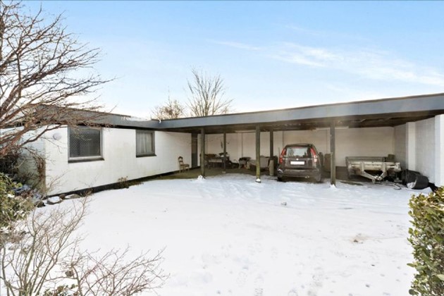Huset er opført i smukke mursten og udstyret med hvide termovinduer samt et elegant skifertag. Der er en stor carportbygning, der kan rumme tre biler, og i umiddelbar nærhed findes en bygning, der let kan omdannes til et hyggeligt anneks eller værksted.