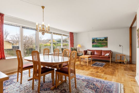 Originale detaljer og fleksibel indretningBoligen fremstår med mange af de originale kvaliteter bevaret. I stuen skaber brede vinduespartier et flot lysindfald, mens fletparket og klassiske detaljer giver huset sin særlige karakter.