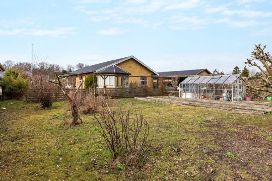 Foto: DanBolig BornholmHave med plads til udelivUdendørs folder haven sig ud mod syd med en stor fliseterrasse langs huset. Her er både køkkenhave, drivhus, pavillon og grøn plæne – oplagt til både afslapning og aktiviteter i sommerhalvåret.