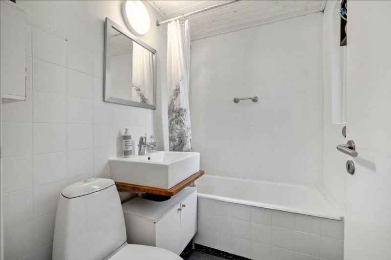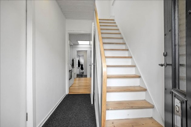 Indretning i stueplanBoligens stueplan rummer en rummelig entré/bryggers med vaskefaciliteter, et lyst og velindrettet køkken, en hyggelig stue med brændeovn samt et værelse, der egner sig til gæster, kontor eller børneværelse. Et badeværelse med badekar fuldender etagen.