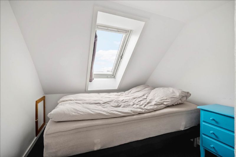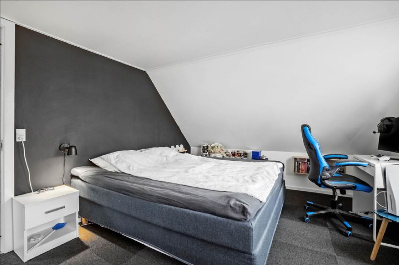 Førstesal med to værelserPå 1. salen ligger to gode værelser med dejlig loftshøjde – det ene med indbyggede skabe.