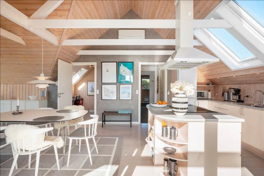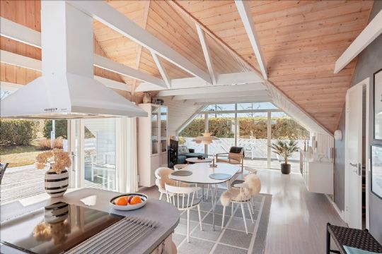 Sommerhuset kombinerer klassisk hygge med moderne indretning og fremstår lyst og indbydende med åbent køkken/alrum, loft til kip og store vinduespartier med udgang til en stor terrasse.