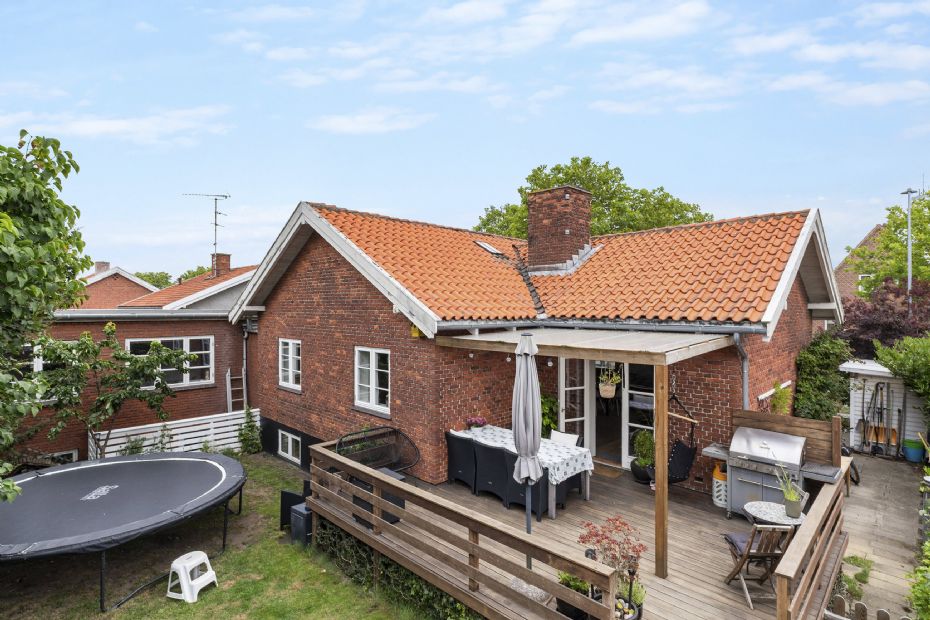 Ejendommen fremstår klassisk med rødt murværk, hvide vinduer og en flisebelagt indkørsel med garage foran. Bagtil findes en grøn plæne og en delvist overdækket terrasse.