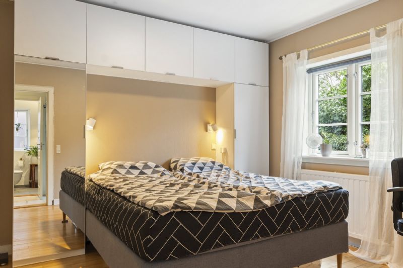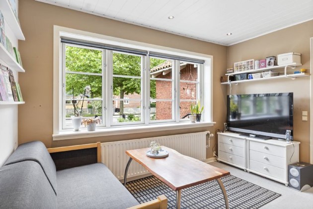 Villaen rummer fire værelser samt et åbent køkken-alrum, hvor stue og køkken smelter sammen til et lyst opholdsrum. Fra stuen er der udgang til en træterrasse, som ligger i forbindelse med den overskuelige have.