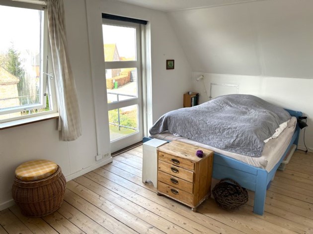 Videre finder man en separat spisestue og et toilet, hvilket understreger hjemmets funktionalitet og komfort. På første salen åbner en forgang op til boligens private rum, herunder et rummeligt soveværelse med udgang til en charmerende altan/terrasse, samt et børneværelse eller gæsteværelse, der tilbyder fleksible anvendelsesmuligheder afhængig af familiens behov.