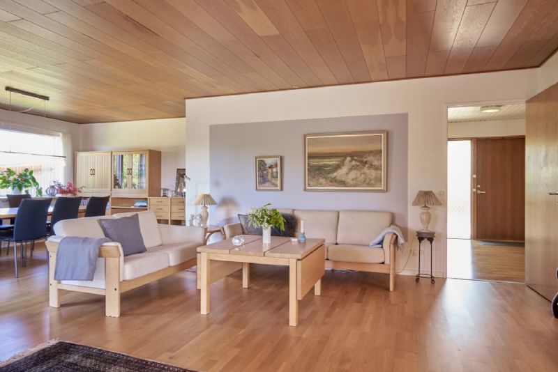Huset indeholder entre, fordelingsgang med garderobe, gæstetoilet med brus, spisekøkken, brygger med fjernvarmeunit, spisestue i åbent plan til opholdsstue med udgang til syd- og vestvendte terrasser.