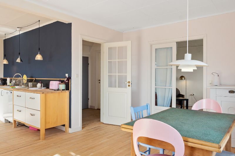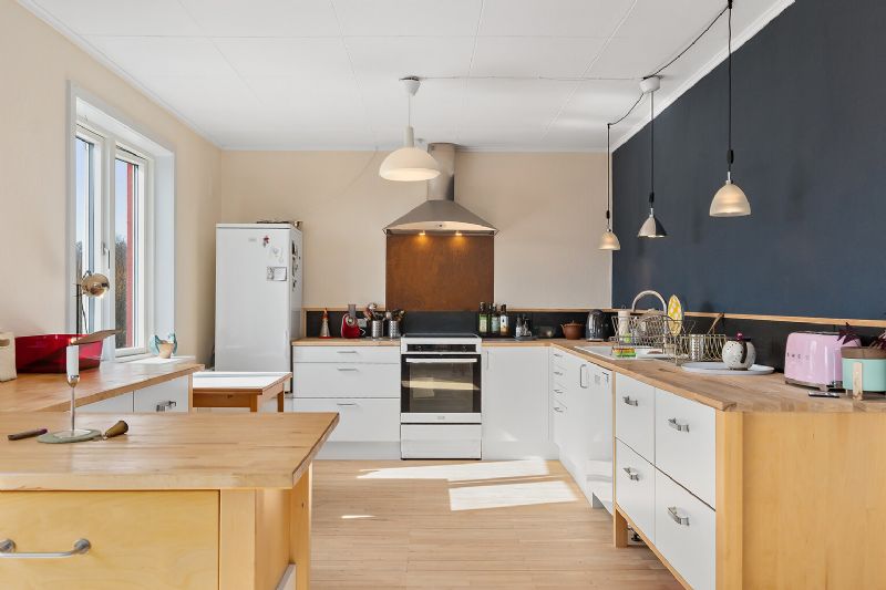 Køkkenet er i nordisk stil og suppleres af lysindfaldet fra de sydvendte vinduer. I forlængelse breder alrummet sig med plads til både spisebord og sofaarrangement.