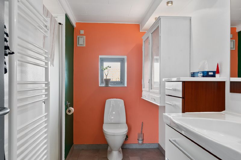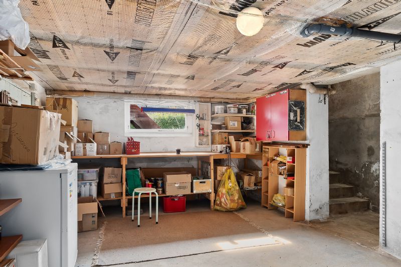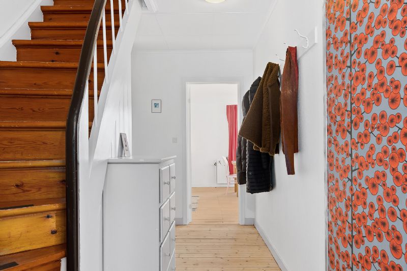 Den velindrettede villa er i halvandet plan med stue og køkken i ét og hele fem værelser. Dette er foruden et bad, et bryggers og et fyrrum.