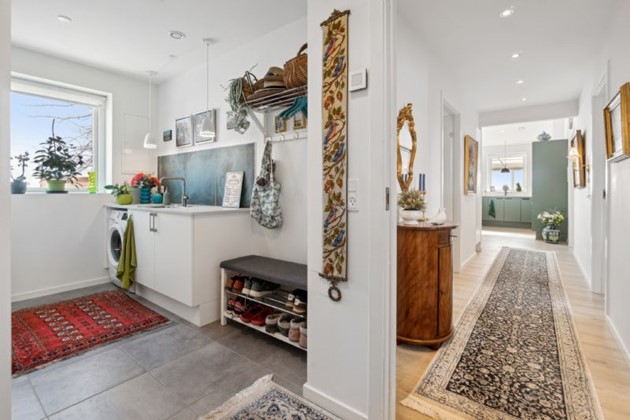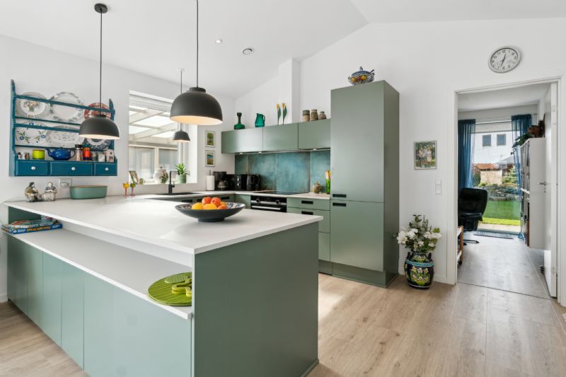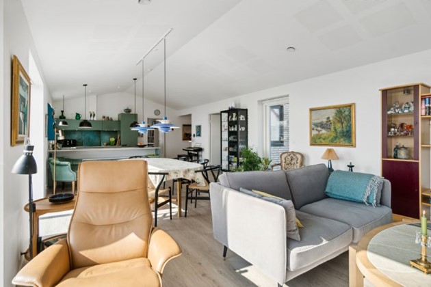 Boligens hjerte er det rummelige køkken-alrum og stue, som er designet i åben forbindelse. Her kan familien samles og nyde udsigten eller en god film. Køkkenet fra Svane er udført i en elegant grøn nuance, der tilføjer en frisk og dynamisk atmosfære til rummet. Med topmoderne faciliteter og masser af arbejdsplads er køkkenet perfekt for den passionerede hjemmekok.