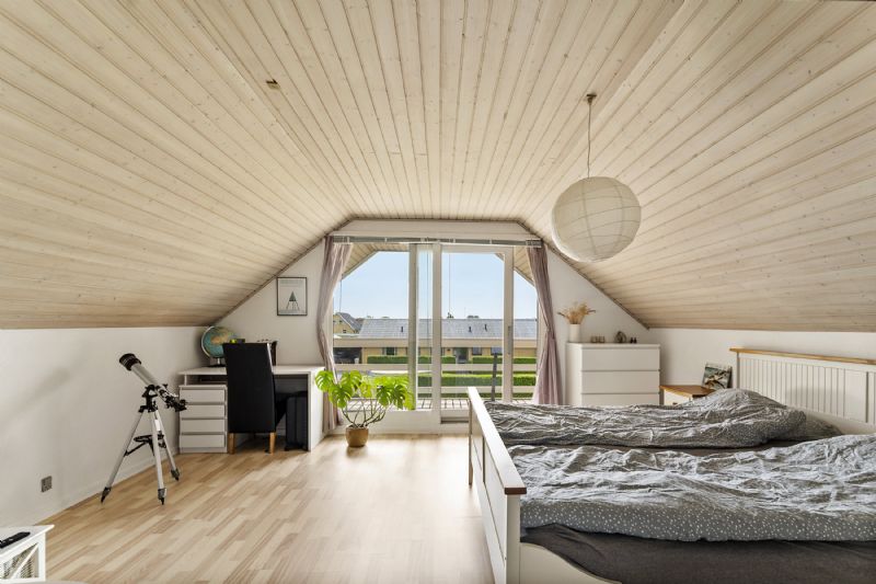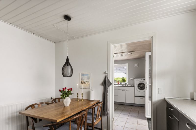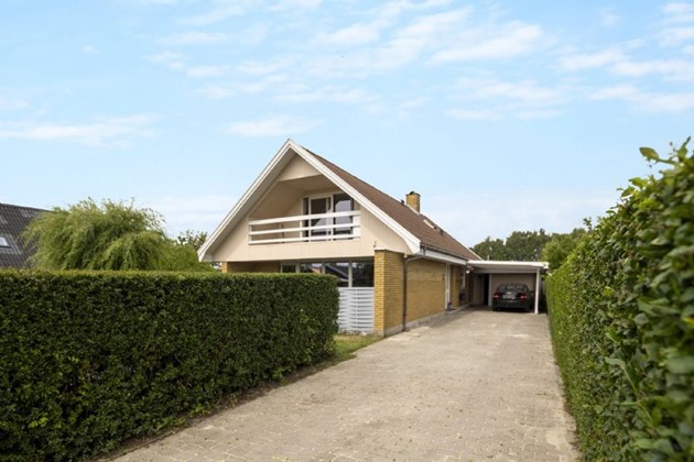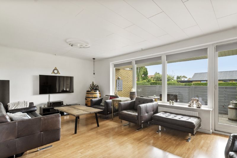 Udenfor er haven indrettet med flere solrige og delvist overdækkede terrasser samt en stor plæne. Bilen kan parkeres i carporten eller i den tilhørende garage – alt sammen beliggende på en blind vej uden trafik.