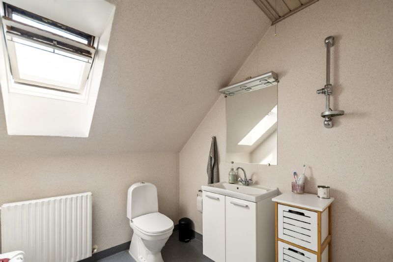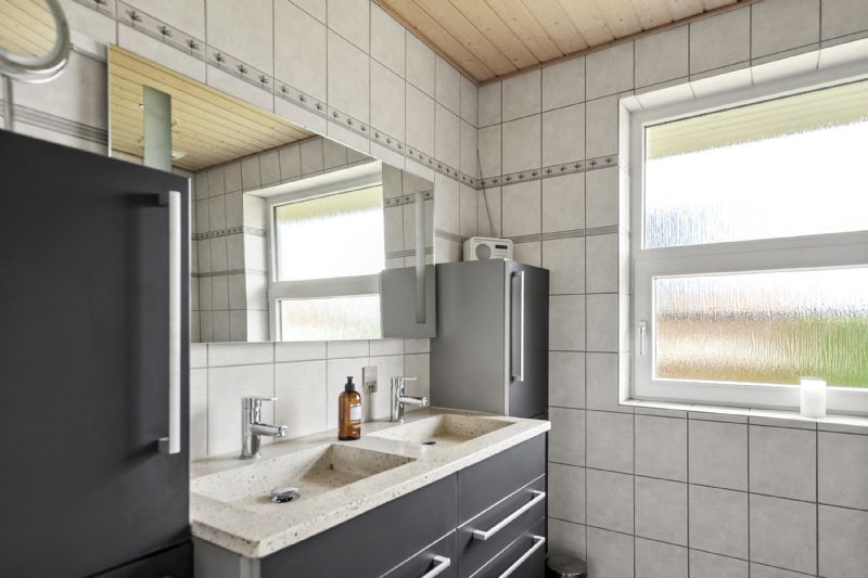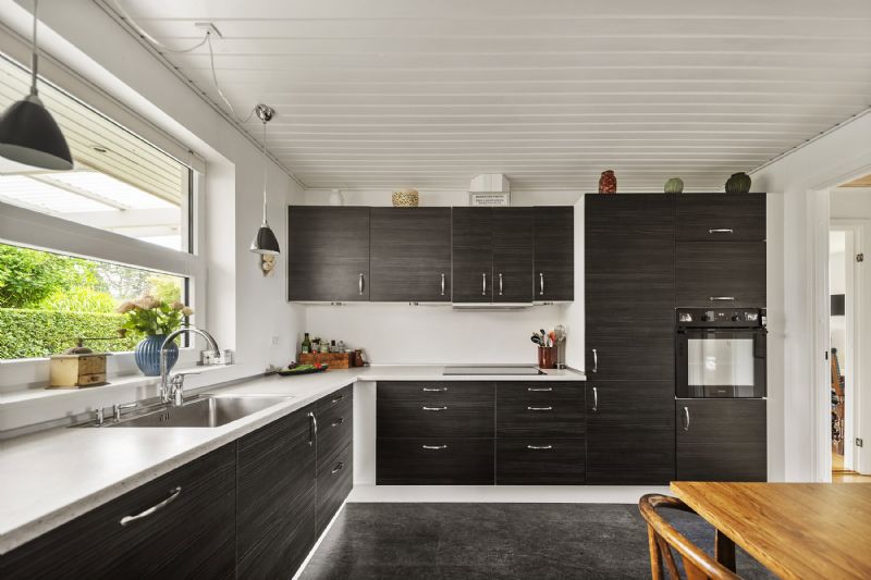 Villaen byder på hele fem værelser, to badeværelser og et moderne køkken med mørke fronter og hvide bordplader. Et af værelserne har egen udgang og egner sig perfekt som hjemmekontor.