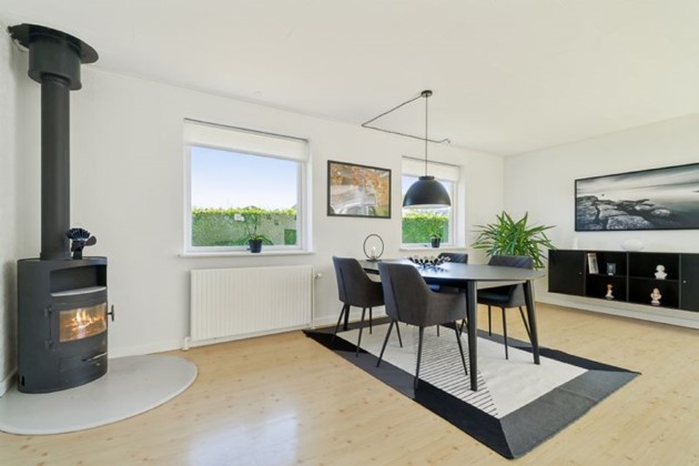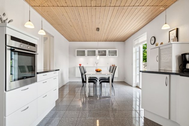 Villaen præsenterer sig med en lys og indbydende atmosfære, som straks byder velkommen indenfor. I stueetagen finder man et rummeligt Svane Køkken med hvide fronter og en elegant sort granitbordplade, der matcher perfekt med det stilfulde granitgulv med gulvvarme. Køkkenet åbner op til en vinkelstue, som tilbyder flere indretningsmuligheder til sofagruppe og samvær. Førstesalen byder yderligere på en ekstra stue, hvilket giver plads til både afslapning og aktiviteter.
