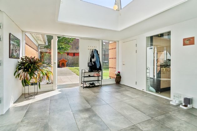 Den glasinddækkede entré med rytterlys, som forbinder de to bygningskroppe, leder videre til den østlige fløj. Her findes yderligere to værelser samt et stort, højloftet multirum, der kan indrettes efter behov, hvad enten det er som hjemmekontor, hobbyrum eller en ekstra stue.