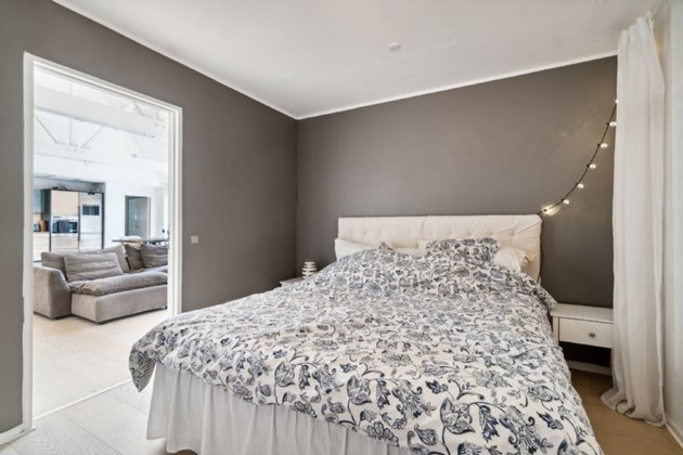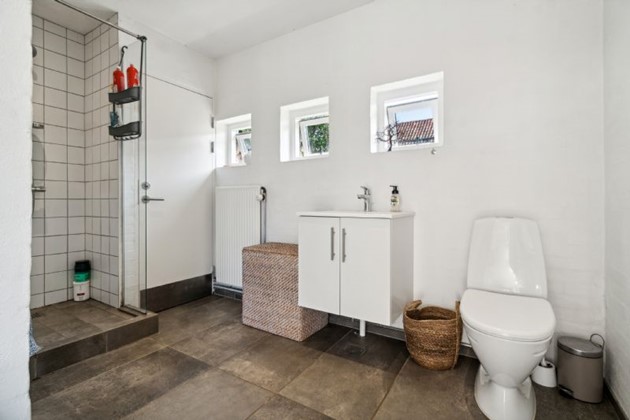 I den ene bygningsdel findes et imponerende køkken-alrum, hvor loftet strækker sig næsten seks og en halv meter op til kip. Dette rum er yderligere beriget med tre dobbelte terrassedøre, der åbner op til en stor terrasse og lader dagslyset strømme ind. Den vestlige fløj rummer også to værelser og to moderne badeværelser, hvilket gør den perfekt som en privat soveafdeling eller gæsteområde.