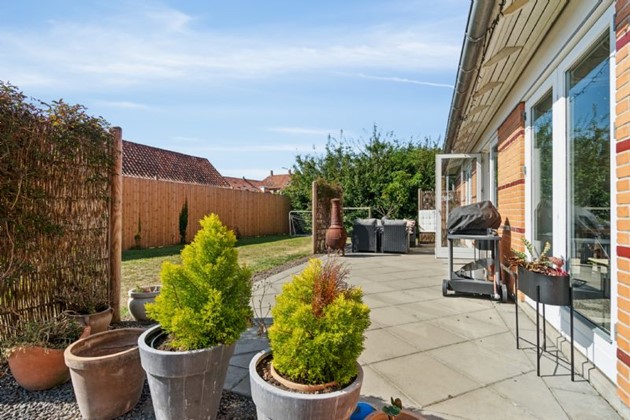 Haven omkring villaen skaber en idyllisk ramme for udelivet. Den store og ugenerede have byder på rigeligt med plads til både afslapning, leg og festlige sammenkomster. Grunden ligger tilbagetrukket fra vejen, hvilket eliminerer støj fra trafik og sikrer en rolig og privat atmosfære, hvor man kan nyde fred og ro uden forstyrrelser.