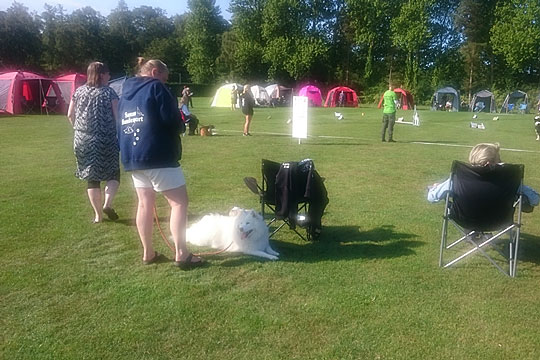 Deltagerne har opslået telte på stadion, så hundene kan hvile i skygge mellem konkurrencer.