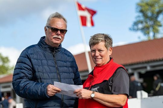 Impressive K har gjort det så godt for Bornholm.nu's Læserklub, at klubben kunne donere 25.000 kr. til Bornholms Travselskabs Charlotte Berg. Gavebrevet blev overrakt af chefredaktør Bjarne Hansen. Foto: Torben Ager / Travfoto Bornholm
