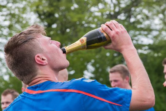Og så kom champagnen frem - her den dobbelte målscorer Mads K. Madsen der sætter flasken for munden![]()