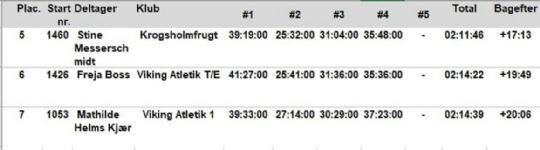 Tre bornholmske kvinder ligger flot i det samlede klassement. Sportstiming.dkLokalt top-10 opgørMest bemærkelsesværdigt hos kvinderne, set med lokale briller, er hele tre bornholmske kvinder med i top 10. Stine Messerschmidt fra Allinge, der stiller op for Krogsholm Frugt, indtager femtepladsen samlet 17:13 min. efter. Den nybagte mor, og torsdagsfødselar, måtte torsdag lade den samlede sjetteplads, Vikingløberen Freja Boss, passere på stigningerne. Samlet er Freja Boss 19:49 minutter efter. På syvendepladsen er Mathilde Helms Kjær fra Viking, der satte lidt tid til de to andre på Hammer Etapen.