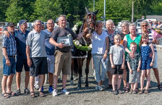 Ejerne af Cerosso i vindercirklen efter det imponerende løb.Handlen med Cerosso kom i stand, da dens nuværende ejere solgte hoppen What a Babe til Lunden som anpartshest.
