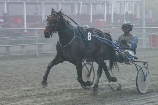 Jetset Onion med Ulrik Christoffersen vandt sin sjette sejr på Bornholms Brand Park, og er nu favorit til at genvinde titlen som Årets Sejrshest. Foto: Torben Ager / Travfoto Bornholm