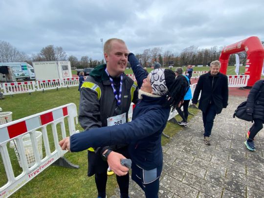 Jørgen Ole får en vinderkrammer af LauraAltså er der tabt ca. 40 kg og første mål er gennemført. I en tid der overraskede både løberen og mentoren. : 2:02 time sagde tiden da Trasborg i flyvende stil ramte målstregen.