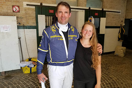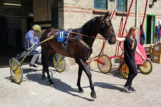 Michala trækker Hennesy Boko med Conrad Lugauer i sulkyen ud fra stalden på Lunden, klar til løb. Men hesten galoperede det hele væk.19-årige Michala Haagensen vandt sidste år Bornholms Travselskabs Ungdomspris og i championatskampen på Bornholm blev det i 2017 til en andenplads - efter champion Sabina Gammelgaard.