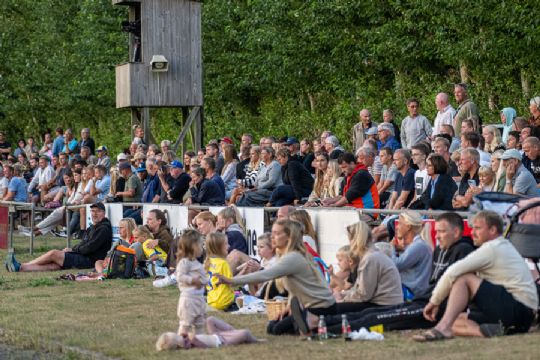 Små 500 tilskuere overværede kampen. Foto : Torben AgerSå fik NB Bornholm travlt. Så travlt at det i det 77 minut kostede et gult kort og en mand på bænken i 10 minutter. Med blot 1 minut igen var der atter kaos i Haslemålfeltet.