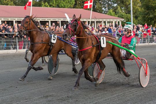 Neptun Hill med Micki Kofod-Mortensen sejrede foran San Siro med Frank Mikkelsen. Fotos: Torben AgerNeptun Hill med Micki Kofod-Mortensen snuppede spidsen i tredje afdeling og kørte ganske enkelt efter fang-mig-hvis-I-kan taktikken, og det kunne ingen. Selvom San Siro efter et langt udvendigt løb var meget tæt på, så blev det kun ved lige ved og næsten. Fornuftig chancekørsel af Micki.