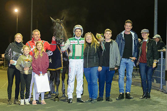 Glade ejere, træner og staldfolk sammen med chefredaktør Søren Christensen fra Bornholms Tidende, da dagbladet er sponsor for revancheløbet.Løbet var samtidig sidste indledende afdeling af Golden League, der sluttede med en sikker vinder i Wega Vang og en lige så sikker andenplads til Solon.